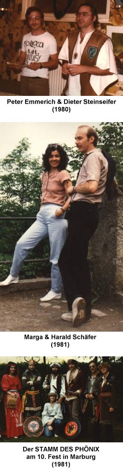 1980 erschien auch der erste größere Beitrag von mir: "FOLLOW Nr. 88" war ausschließlich einer von mir verfaßten PHÖNIX-CHRONIK - in der ich die Geschichte des Clans niederschrieb - gewidmet. Dann war in diesem Jahr das 9. Fest der Fantasie in Herzberg (Ja! Ich war dabei!), mein erstes Fest! Im September lernte ich meine Frau Bianca kennen, die auch sofort für den im selben Monat stattfindenden Konstanz-Con eingespannt wurde (diejenigen, die damals dabei waren, schwärmen noch heute davon!).